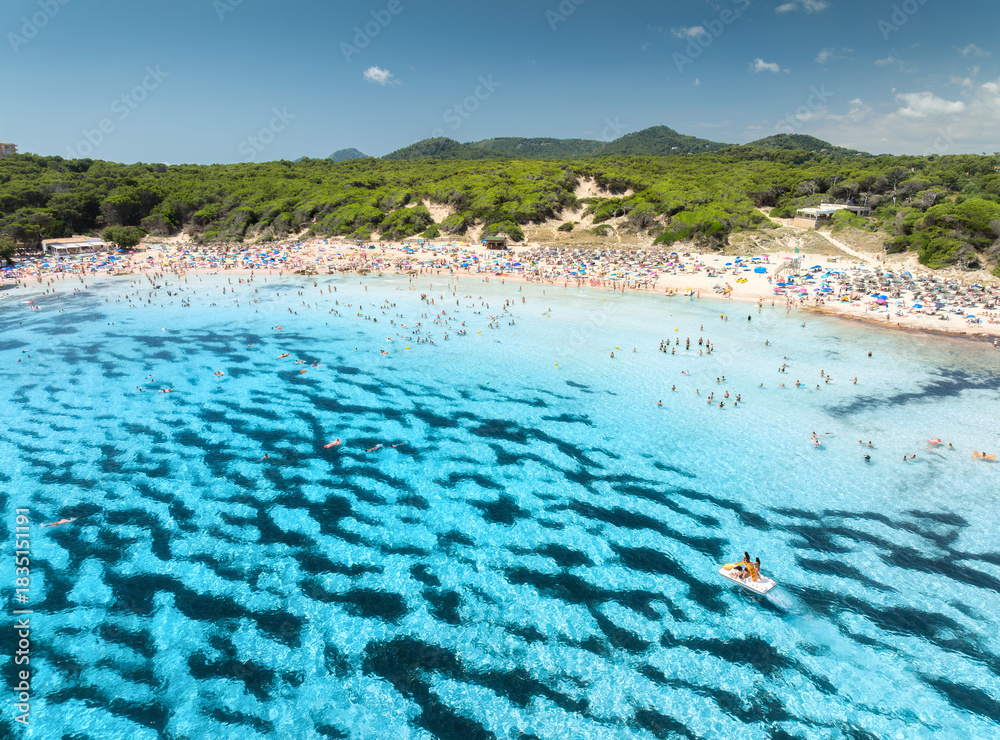 Aerial view of colorful umbrellas on crowded sandy beach, swimmers in blue sea, green trees on sunny summer day. Mallorca, Balearic Islands, Spain. Tropical top drone view. Turquoise water. Travel