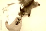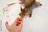 The squirrel eats a walnut from his hands. Winter bait for wild animals in the forest. The concept of kindness and humanity. Selective focus, close-up portrait.Tame and bold squirrels live in the park