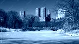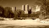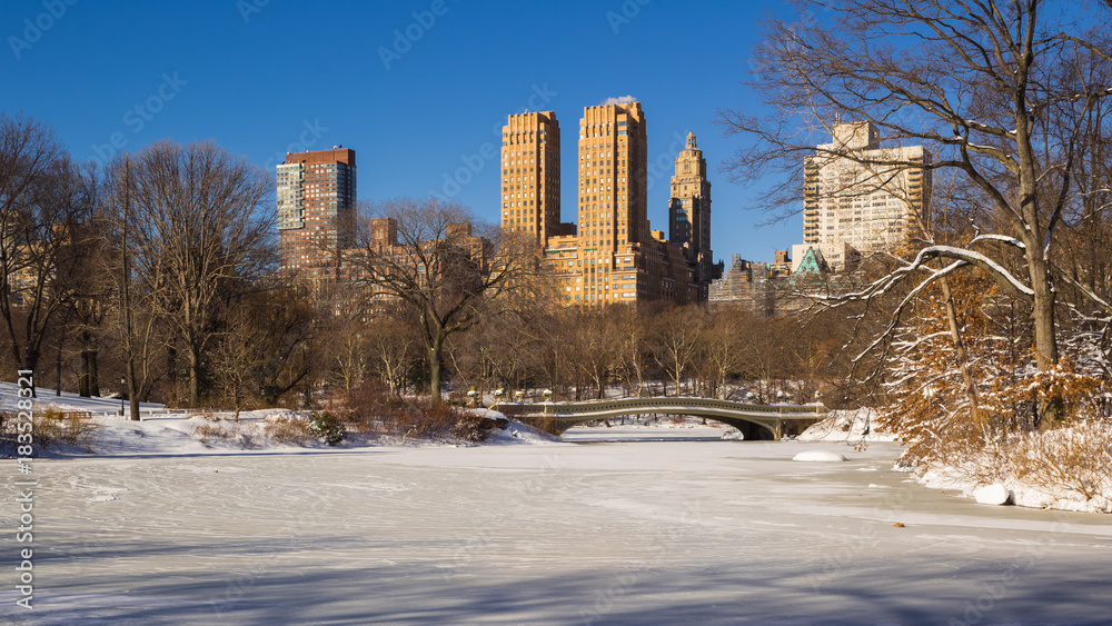Frozen Lake in Central Park with the Bow Bridge in Winter. Upper West Side, Manhattan, New York City