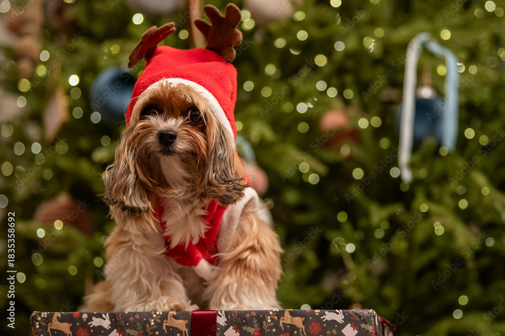 Cute dog in reindeer hat and red sweater sitting on Christmas gift in front of blurred tree with lights