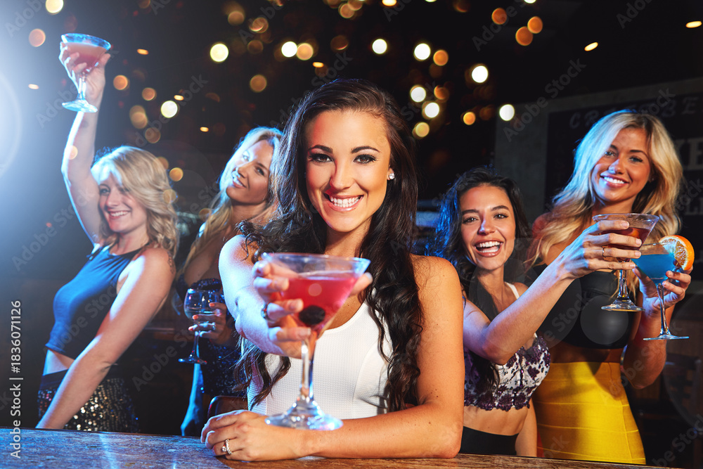 Happy women, portrait and friends with drink in nightclub for party, dancing event or celebration. Group, female people or smile with alcohol, cocktail or bokeh for nightlife, disco or new year