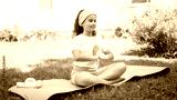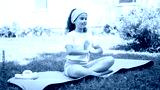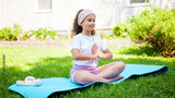 Girl practices yoga on mat in grass during sunny day