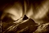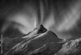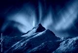 Northern lights over the snowy mountains at night in Lofoten, Norway. Aurora borealis above the snow covered rocks. Winter landscape with polar lights, mountain peak. Starry sky with green aurora