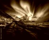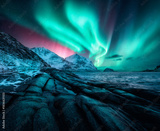 Aurora borealis on night starry sky with vibrant green and pink colors, rocky shore in winter. Landscape with northern lights, beach with stones, sea and snowy mountains in Lofoten Islands, Norway