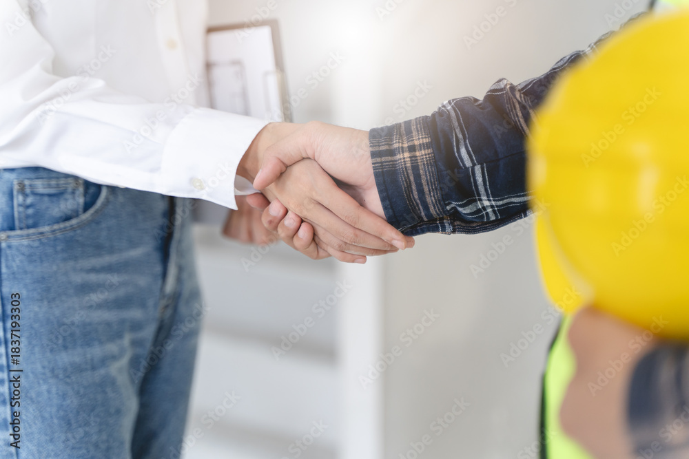 construction worker and contractor. Client shaking hands with team builder in renovation site.