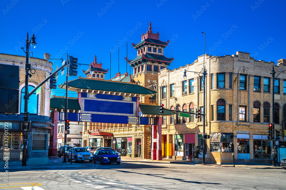 Chicago, USA. Chicago historic Chinatown gate and street view