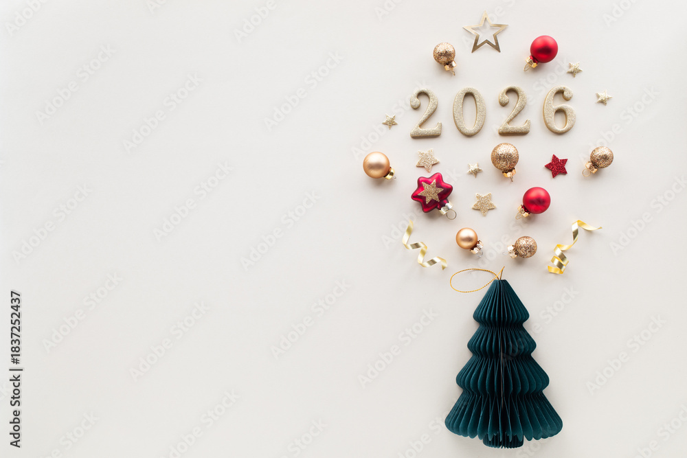 Decorative green fir tree and 2026 Happy New Year glittering golden numbers with festive party baubles top view, flat lay.
