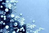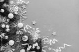 Festive Christmas background or greeting card with fir branches, white berries and shiny silver decorations and baubles on light green table top view, flat lay.