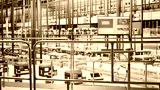 Monitor displaying industrial analytics dashboard for Industry 4.0 photovoltaics plant equipment. Solar panels smart factory display visualizing robotic arms performance and metrics from sensor data