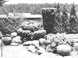 Winter garden landscape showing snow covered evergreen shrubs and trees with a frosted forest in background
