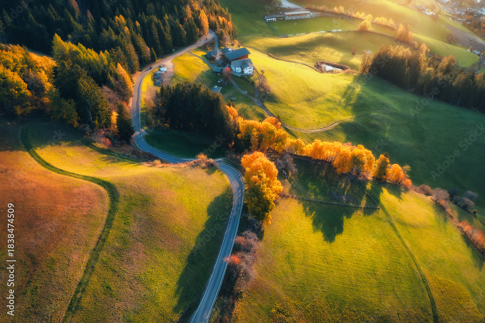 Aerial view of green alpine meadows, orange trees on the rolling hills, houses in mountain village at sunset in autumn. Santa Magdalena, Dolomites, Italy. Top view of houses, road, forest in fall