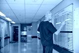 Surgeon, whiteboard and writing in hospital with schedule, operation theater roster or organization. Mature man, doctor and notice board in clinic with healthcare calendar, surgery timetable or plan.