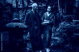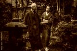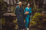 Asian senior couple enjoying a leisurely stroll in a beautiful japanese zen garden, wearing traditional kimonos, representing culture, peacefulness, and a serene lifestyle
