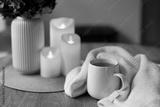 Cozy winter home interior with warm candlelight, wool sweater, hot tea and LED decor creating a calm hygge atmosphere