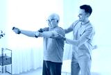 Doctor therapist aids a senior patient during physiotherapy, guiding arm joint stretching exercises for rehabilitation. Therapeutic session helps improve movement and supports joint health.