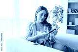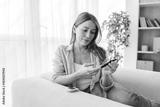 Relaxed Woman Uses Smartphone On Couch At Home With Plant And Bookshelf