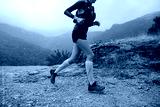 Woman running mountain marathon in autumn and rainy weather