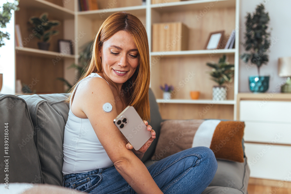 Relaxed Woman Sitting On Sofa Using Smartphone With Wireless Patch On Arm In Living Room