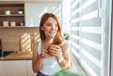 Smiling Woman In Modern Kitchen Holding Yellow Mug By Large Window In Natural Light Sunlit