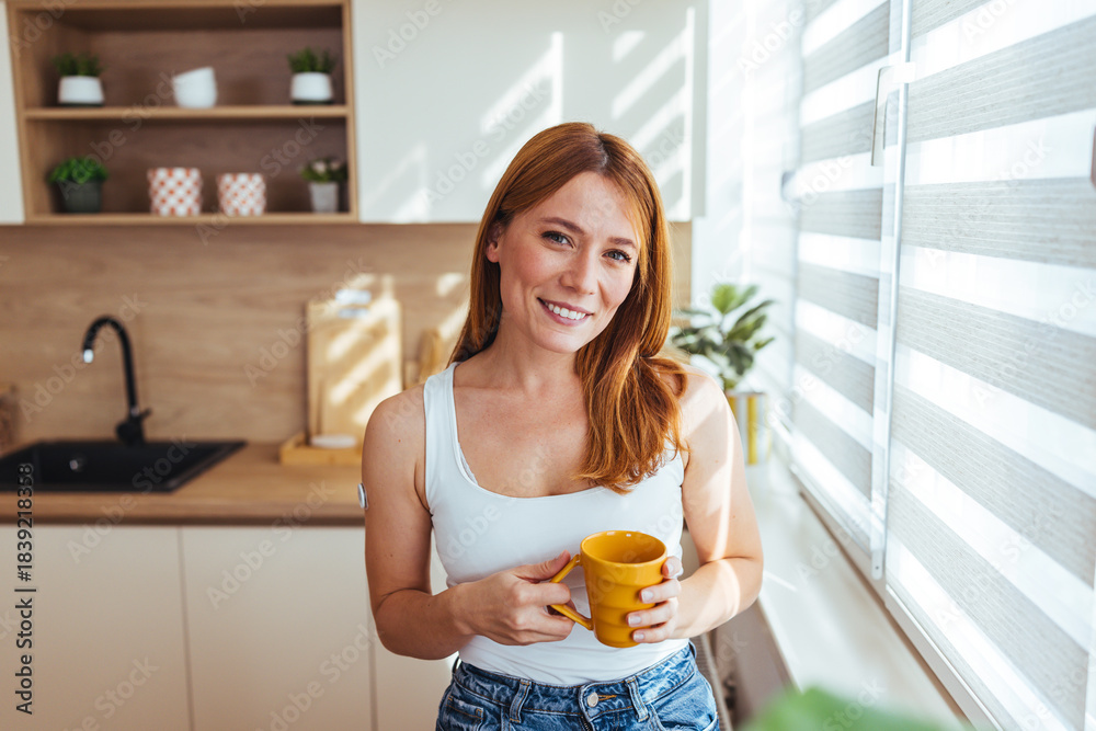 Smiling Woman In Bright Kitchen Holding Yellow Mug In Morning Light