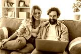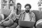Casual Couple On Sofa Using Laptop At Home Living Room, Cozy, Happy Moment