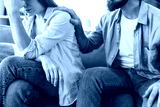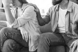 Couple Comforting Each Other on Sofa After Argument, With Supportive Hand on Shoulder