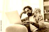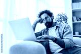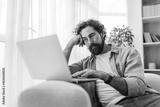 Thoughtful Man Working on Laptop at Home in Casual Indoor Living Space