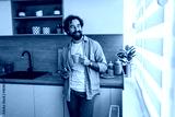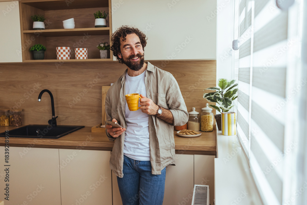 Relaxed Man in Modern Kitchen Sips Coffee While Checking Phone by Window
