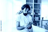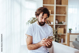Focused Man Using Smartphone At Home In Modern Living Room With Bookshelf