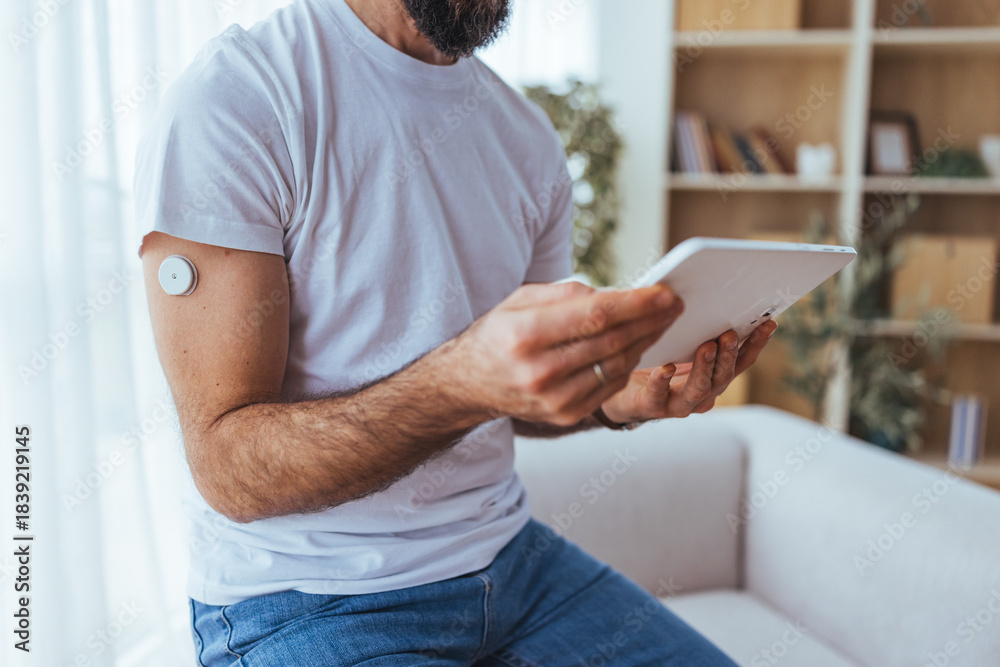 Man Using Tablet at Home With Arm Patch Medical Device for Health Monitoring