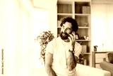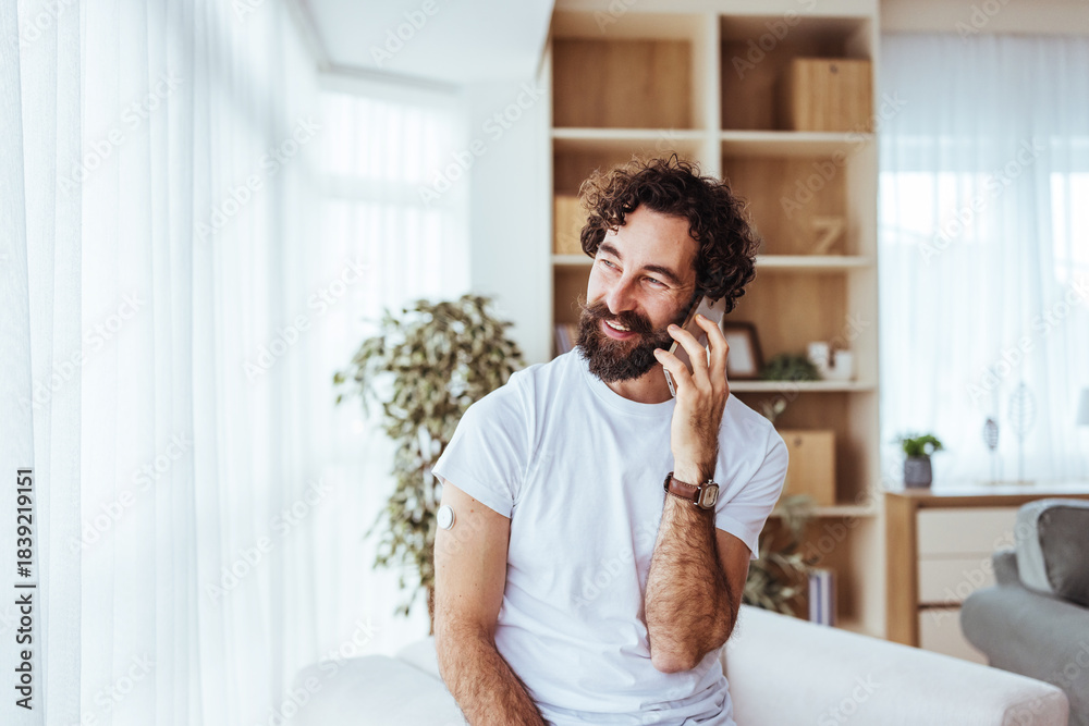 Casual Bearded Man Smiles While Talking On Phone At Home In Modern Living Room With Plants