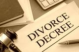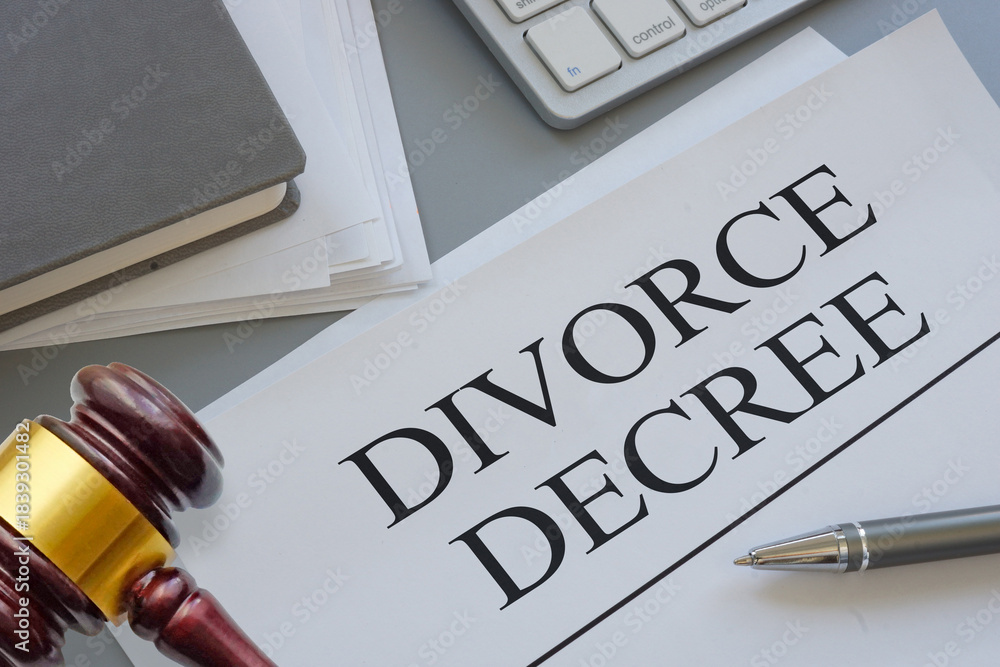 Divorce Decree Document with Judge's Gavel and Pen. Legal Separation and Divorce Concept with Official Papers. Family Law and Judgement Concept