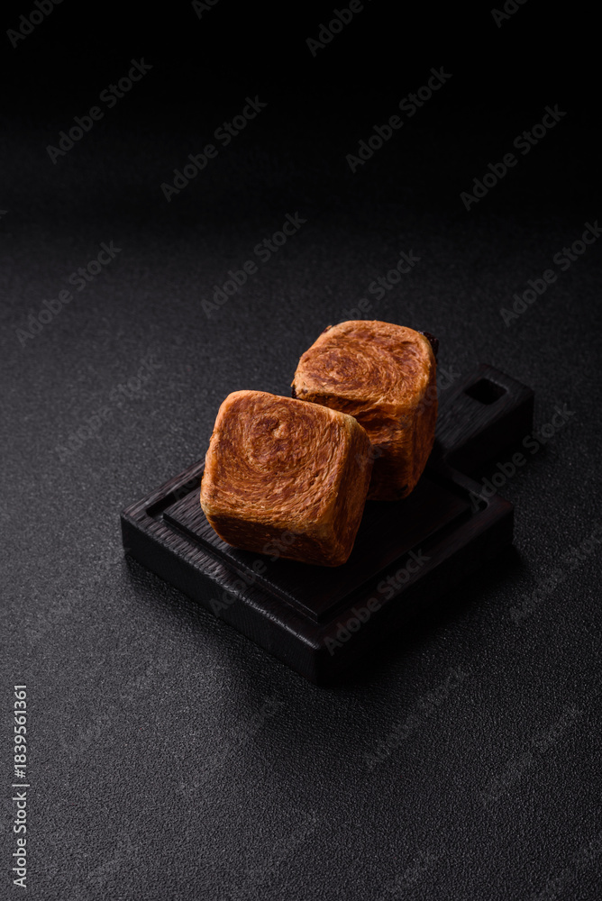 A French cube croissant with chocolate filling, a sweet breakfast pastry. Cube croissant