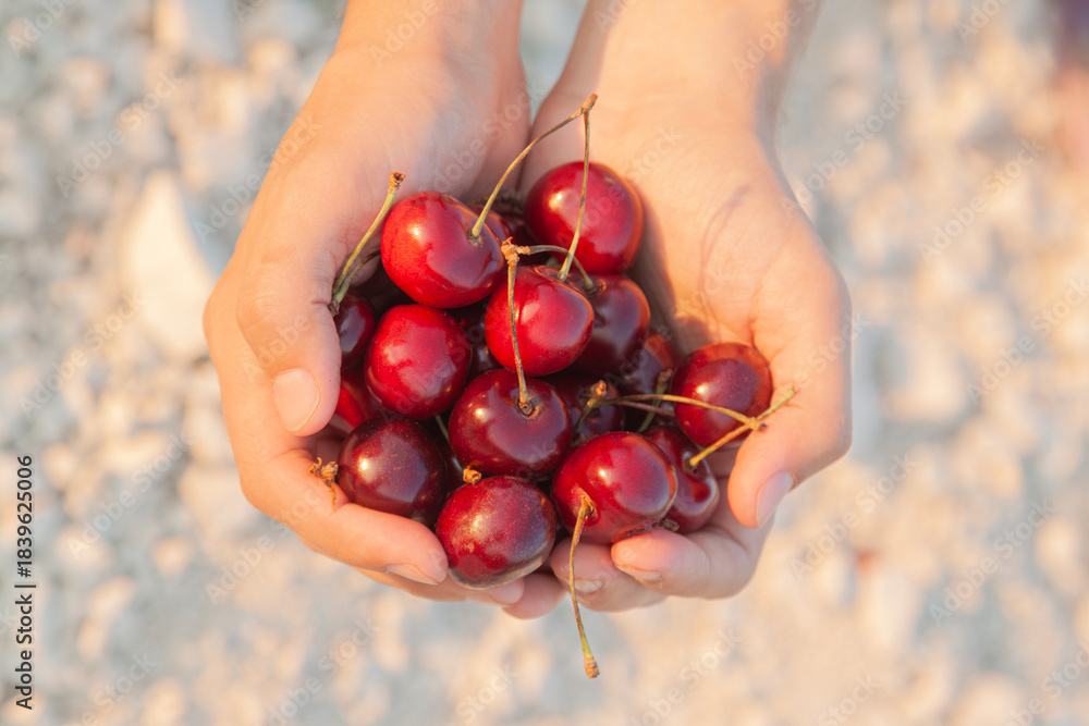 A top view of a man's hands full of large, ripe red cherries. The scene focuses on the hands holding the vibrant fruit, showcasing their freshness and the man's care Copy space. Flat lay