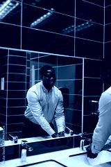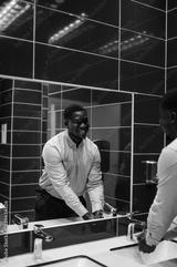Young black man washing hands in a bathroom