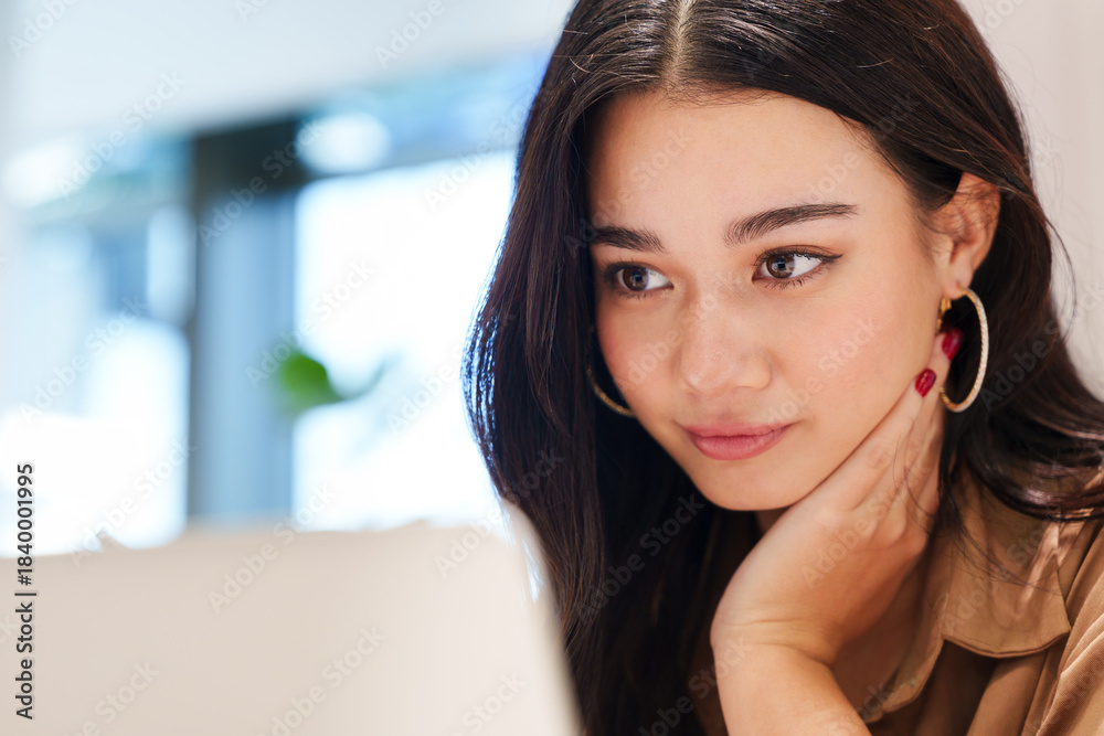 Young happy, beautiful, stylish, elegant Asian woman in brown shirt smile, look at computer laptop in modern white room. Digital technology, modern lifestyle, online learning and entertainment