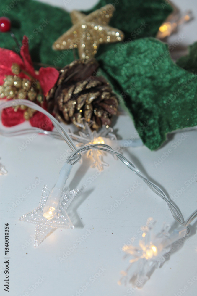 Red poinsettia flower with golden accents, green pine leaves, sparkling Christmas light bokeh