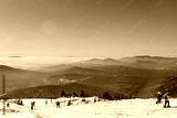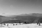 Panoramic View from Green mount, Sheregesh ski resort. People tourists begin descent down mountain with beautiful view of Altai Mountains covered in soft blue haze. Active winter rest in Russia.