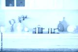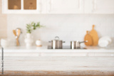 Kitchen bleached wooden table top for product display with deeply blurred counter interior background