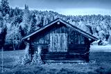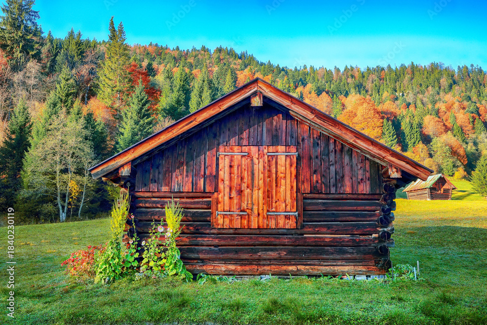 Fabulous view of alpine valley with wooden huts near Wagenbruchsee (Geroldsee) lake