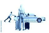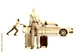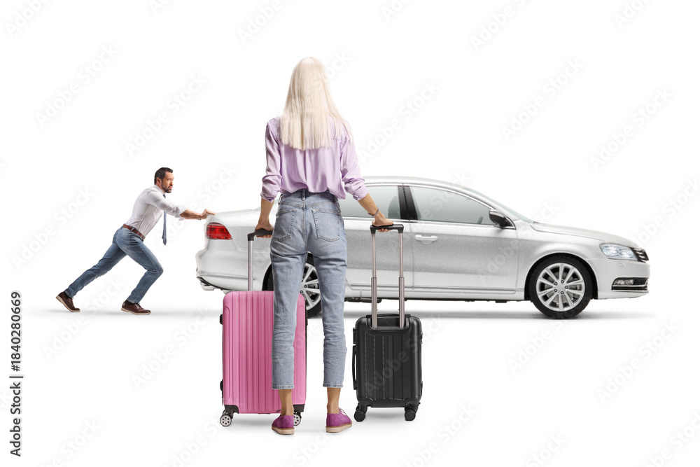 Full length profile shot of a man pushing an inoperable car and woman waiting with suitcases