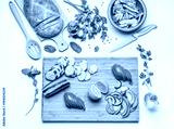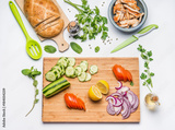 Healthy lunch cooking. Clean eating layout and diet nutrition concept. Various fresh vegetables ingredients and roasted chicken or turkey meat for salad on white table background, top view
