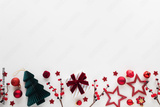 Stylish flat lay Christmas border with decorations, gift box and red golden baubles top view. Winter festive greeting card.