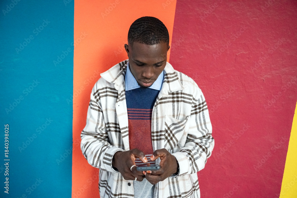 Young man engaged in texting with mobile phone against vibrant colored wall in an urban setting