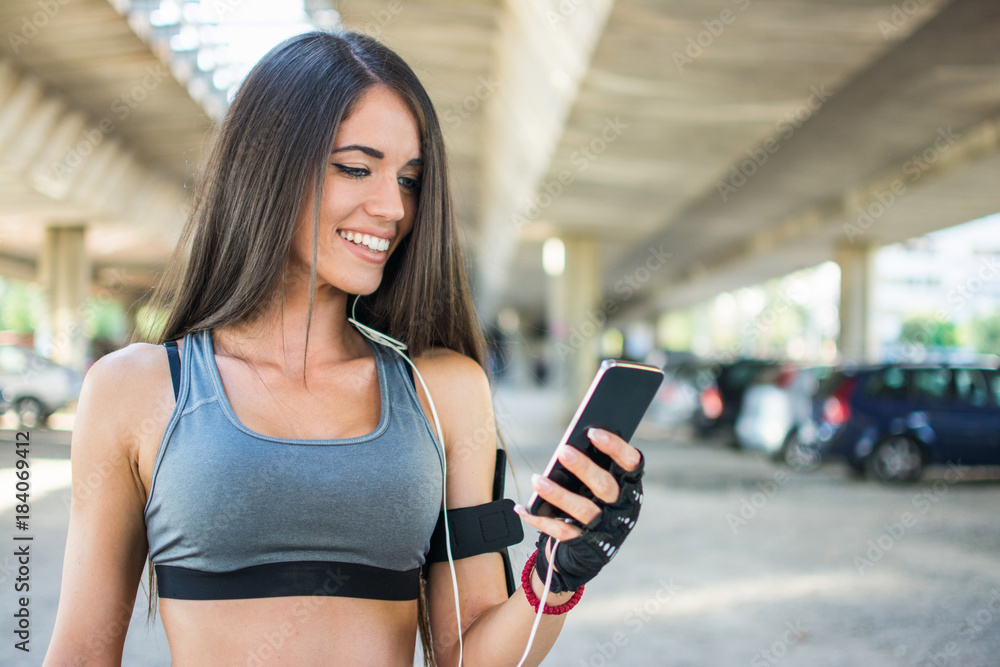 Cheerful sporty girl with earphones using smart phone outdoors.
