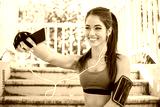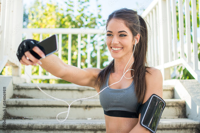 Cheerful young sporty woman taking a selfie on smart phone while sitting on stairs outdoors.