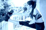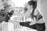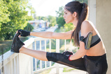 Young beautiful woman doing warming up and stretching with her leg raised to the bridge's fence.