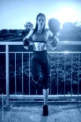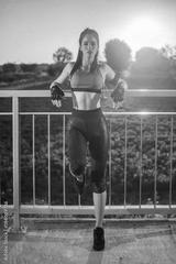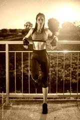 Sporty woman leaning on bridge's fence outdoors during the sunset.