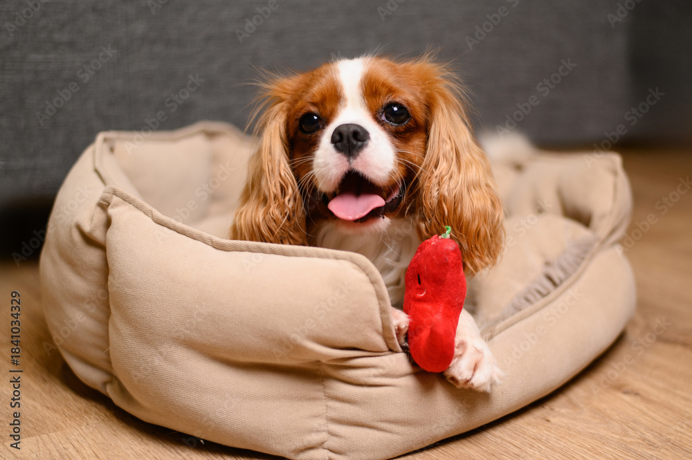 Playful Cavalier Spaniel, tongue hanging out from red toy, lies in cozy beige bed. Dog plays with its favorite toy at home, dog's lifestyle. Pet care, love for pet