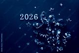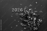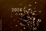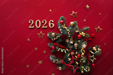 2026 Happy New Year golden glittering numbers and fir tree branch on red background top view.